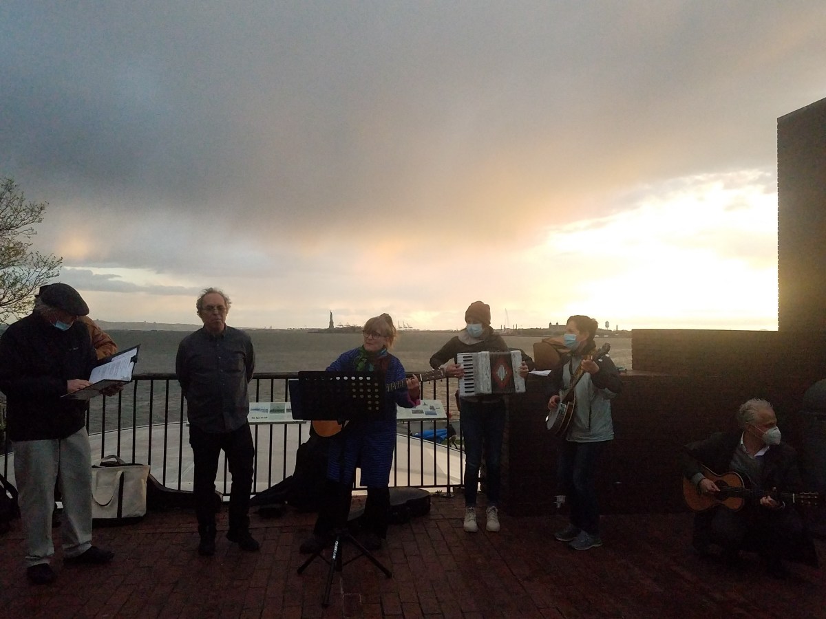 I put the earbuds in my bag and waited for Fred. The wind started howling fiercely. My app said gusts of 36 MPH, but it felt like more. I started to get cold, god knows what the windchill dropped to. Then it started to rain. I didn’t have rain gear. I was afraid the Singing Circle would be canceled. Five minutes later it stopped, the winds calmed, and the sun was out. Fred arrived and we went for dinner. There was an outdoor beer garden on the south end of Battery Park, I figured there was a good chance they were open, and I would have bratwurst. I wasn’t but there was an indoor restaurant in the building next door. We ate there. None of this would be a big deal except that Fred was the first friend I’ve made plans with other than Katherine since March 11, 2020. This was my first time in a restaurant since before that. There were only two other tables of people in a large space and Fred, and I were both fully vaxxed more than two weeks ago. I might have been hesitant without Fred there but he’s a microbiologist that teaches at a med school and has been cautious from the start. If it was safe enough to past muster with him I was fine with it. What a luxury, the food was great, the conversation was great, and I had a view of the Statue of Liberty. How can you beat that? I don’t know the name of the place, but you can’t miss it, I highly recommend it.