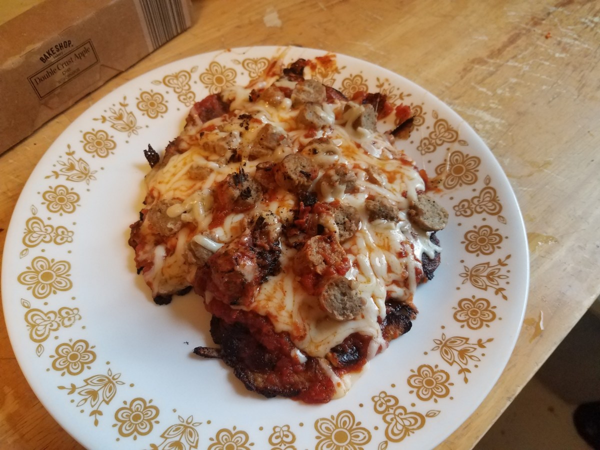I didn’t have time between the Met and Knick games to make the dinner I planned, roasted chicken quarter, so I made my new invention, matzoh brei pizza. This turned out better than the first time as it held together better. When It was done I popped in the microwave for a minute to fully melt the cheese. Next time I should pop it in the oven, that’s one of the advantages of a cast iron skittle. That would involve preheating the oven. That sounds so good I want to try it right away.