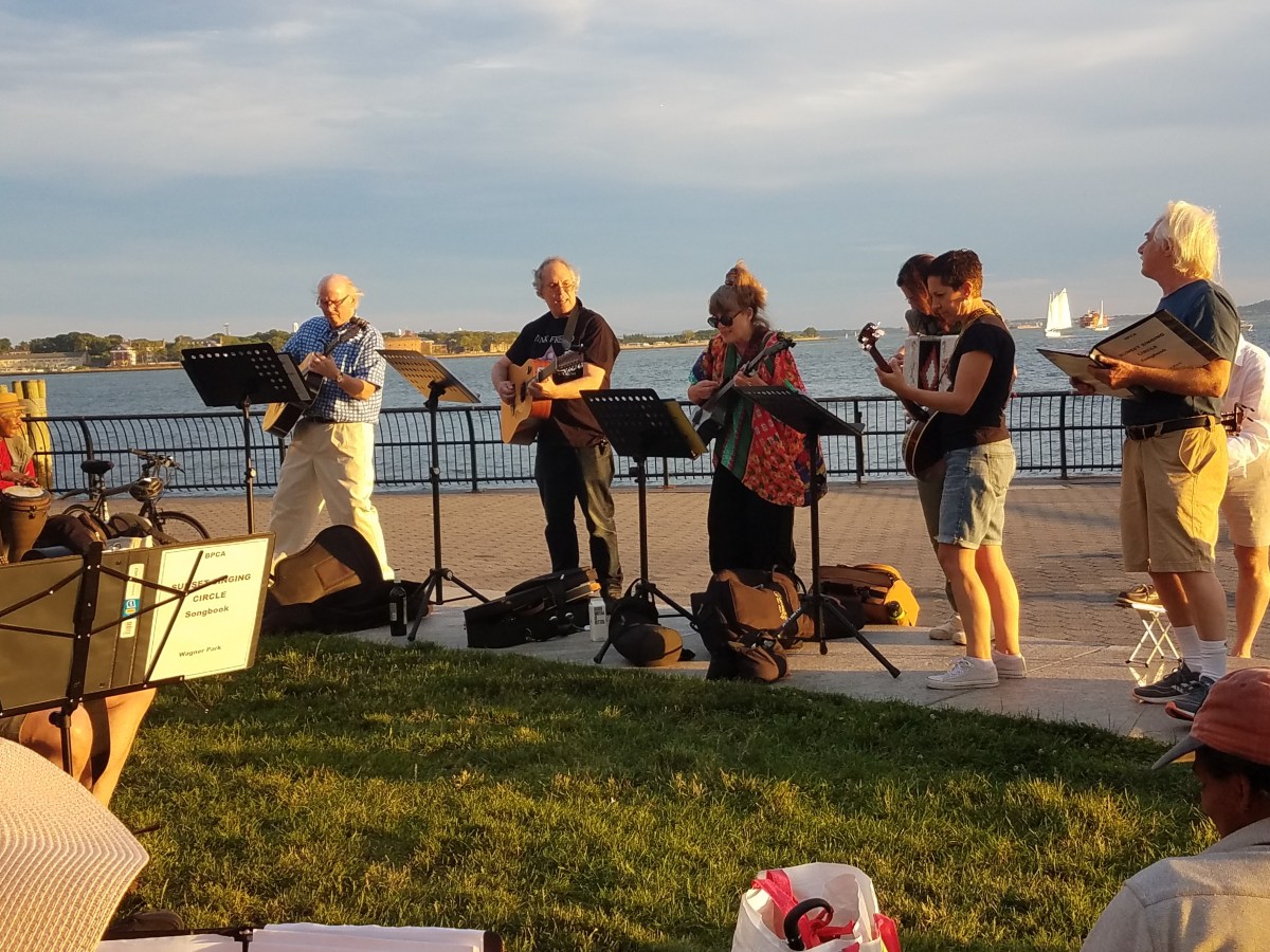We arrived at Wagner Park just before the singing started. We are usually among the early arrivals. It was nice to see David and Terrie (not Terre) back after missing a few for a health problem. For the first time this year the guy that hands out Hershey’s miniatures was there. Most years he’s at most shows. As usual we made sure to say hi to Frances who runs the event for the Battery Park City Authority. This is a community. I’m a sucker for community. I wonder how that informs my atheism. Many people find community through their house of worship, do I look for it in other places as I don’t have that? Does finding community in other places reduce my need for religion? As is usual in chicken and egg questions the answer is both.