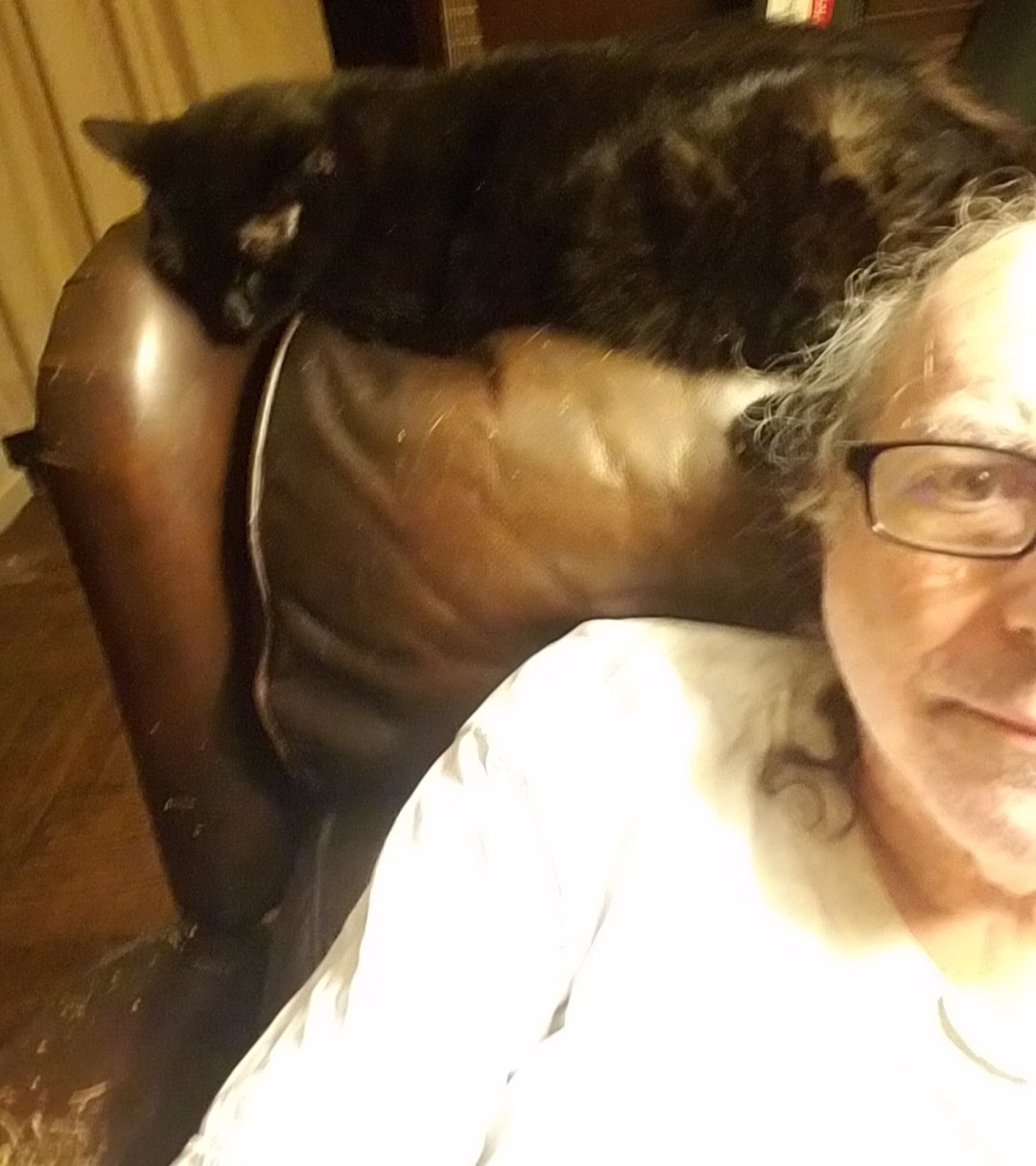 I had an upbeat fun entry planned for today, I did something upbeat and fun, I’ll get to that but it’s not the most important thing that happened and not what’s on my mind. Lefty the black cat you often see in pictures with me died early this morning. My roommate and I spent all night at the vet ER. Lefty was my roommate’s cat but Lefty, recently adopted me, and we’ve spent a lot of time together. My roommate noticed something was wrong before I did. Lefty was spending most of her time in the windowsill and not moving. It was not as noticeable to me because it’s in the room where I spend most of my time and until the last few days when I came into the room she bound up to the top of my chair and be my headrest or sit on the arms when I wasn’t paying enough attention. She started spending more time on the sill, but I thought it was just her new favorite spot. She’s always changed her favorite spot.