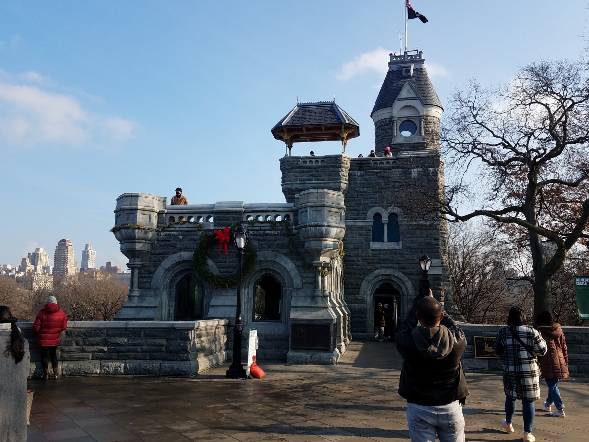 The first part of the day did not go as smoothly. I had an appointment for a COVID-19 test at North Bronx Central Hospital. I arrived 20 minutes early as I was advised to. I was told that all appointments were canceled as they were overwhelmed. I don’t know what happened. Did they take walk-ins even though they said appointment only? Did they fall behind for some reason? I felt that they should have texted everyone whose appointments they canceled to let us know. It’s only an 11 minute walk from me but I made my plans around the appointment. I would have told Erika I could make it earlier if I had known. I texted her and she could leave in 15 minutes, so it wasn’t that bad. It gave me time to grab something from DD. When I got to the City, I had time to stop at Krispy Kreme for my free donuts, and I had time to appreciate New York at Christmas. When I got to Belvedere Castle a violinist and bass player were performing classical and holiday music. They were excellent and had an enjoyable time listening to them and seeing the view. I was reminded that the Castle was built to be a lookout tower. I love Belvedere Castle.