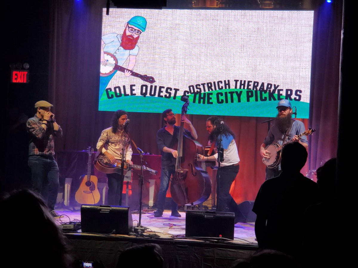Yesterday did not start off well, my therapist canceled for the second time in a row. As I can get off on an insanity plea for the next week, I suggest you be very nice to me. I am very trusting that people will understand when I’m joking. Fortunately, my other mental health treatment, live music, wasn’t canceled. I ventured down to Brooklyn to see Cole Quest and the City Pickers at Atlantic BKLN, a new venue. I left later than I planned but arrived just as the show was about to start. I saw Cole in front of the stage, not on it, and talked to him. There was an opening act on first. I didn’t expect that. Certainly, didn’t expect to see people I knew, The four members of the Sean Trischka Trio. See what teaching common core math leads to? This is what was projected on the screen behind them.
