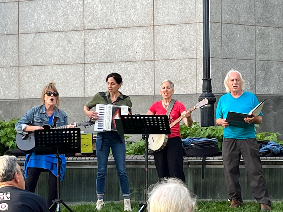 I was up front, so it was hard to see but I think the crowd was smaller than usual. With all the rainouts and the relocation that wasn’t surprising. I’m sure some people saw the opera set up and gave up. This changed my dynamic. As I’m a regular I usually let other people make the song requests and just chime in at the beginning when people are getting the hang of it and throw in the first suggestion. After that there is back up of suggestions and I keep quiet. Last night there were a few lulls with no songs in the hopper, so I chimed in to keep things moving. Once I do then someone always suggests another song. Many people are shy and don’t feel comfortable just shouting out requests. I don’t feel comfortable doing it, but I don’t feel comfortable doing many things, so I’m used to that. Though we started with songs primarily by the great “modern” songwriters, Dylan, The Beatles, Joni Mitchell, and Pete Seeger, there were more calls for what I usually request, the traditional songs. It’s a good day when other people request Shenandoah and Red River Valley. After doing this for years I’m actually beginning to learn the lyrics of some of the songs. That’s nice as I can look around instead of reading the words as I sing. Despite my less than good voice I sing. You should come and sing too. With Terre and the Terrettes leading us the crowd sounds good. It’s much easier to hit the right note when you are hearing the right note. I wish more of my friends would come. This is special.