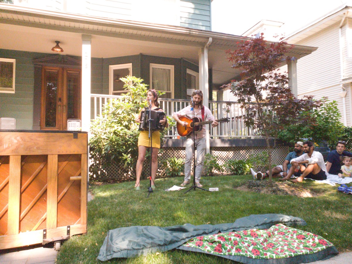 I was almost late to Our Band because when I got to the D train station it was closed! I had to walk over to the 4 train. I went to switch to the Q at 14th Street and only after getting to the Q platform did, I find out that it was not running in Manhattan. I had to get back on the 4 train and switch to the Q at Atlantic Ave. The up shot is I got the porch where Our Band was playing just as the show was scheduled. You read right, I said porch. Artmegeddon is a neighborhood arts event right on the not so mean streets of Ditmas Park. They are the opposite of mean; the neighborhood is particularly friendly. The host of the show was Aaron who runs Operation Gig, a porch concert series in Ditmas Park. This show had double representation; it was also part of Operation Gig. It was scheduled for weeks ago but it kept raining when on days they were supposed to play.