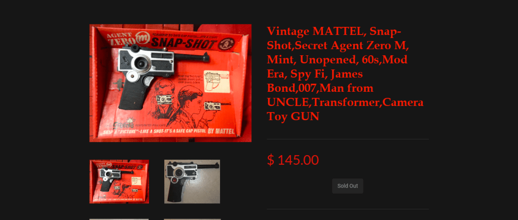 I have left out the biggest bonding element the show revealed for me and Jill. Remember how I said she wanted to be a spy. What cool kid didn’t? She said that she had a James Bond Camera that turned into a gun. I had a Man from U.N.C.L.E camera that turned into a gun. It was probably the same toy, rebranded after The Man From U.N.C.L.E was canceled. After the show Jill saw it on sale online for a ridiculous price. I just found it. I was right it was also called Agent Zero.
