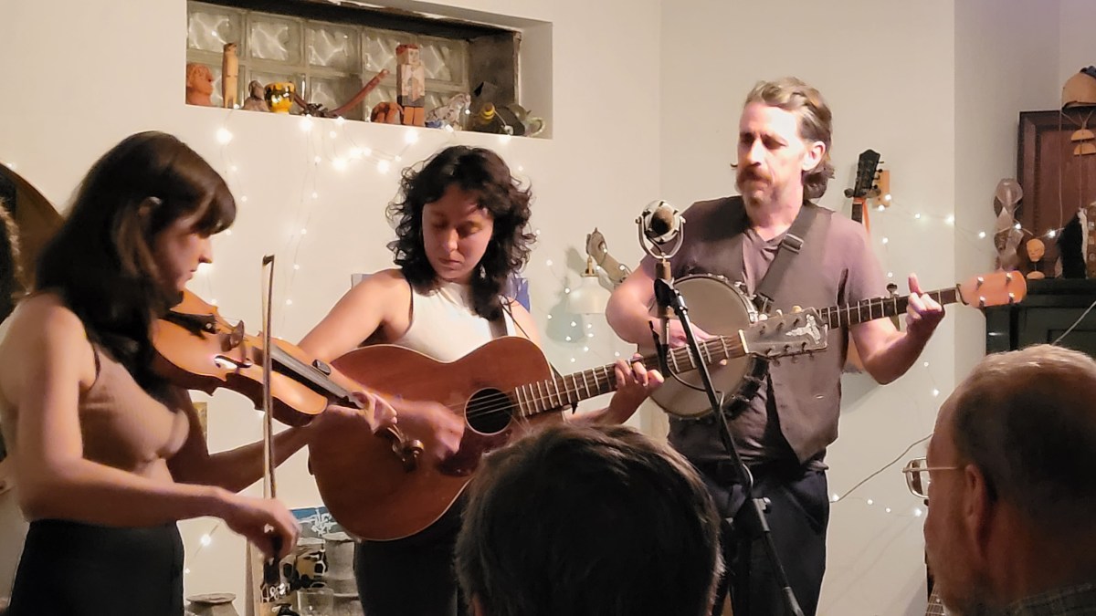 If you know Stephanie, Elise, and Eamon, I don’t have to tell you how the show was. They are all great so of course the show was great. Steph played fiddle, Elise guitar and accordion (not at the same time), and Eamon banjo except when Elisa was on the squeeze box, then he played guitar. They played originals and fiddle tunes, and other trad or trad sounding music.