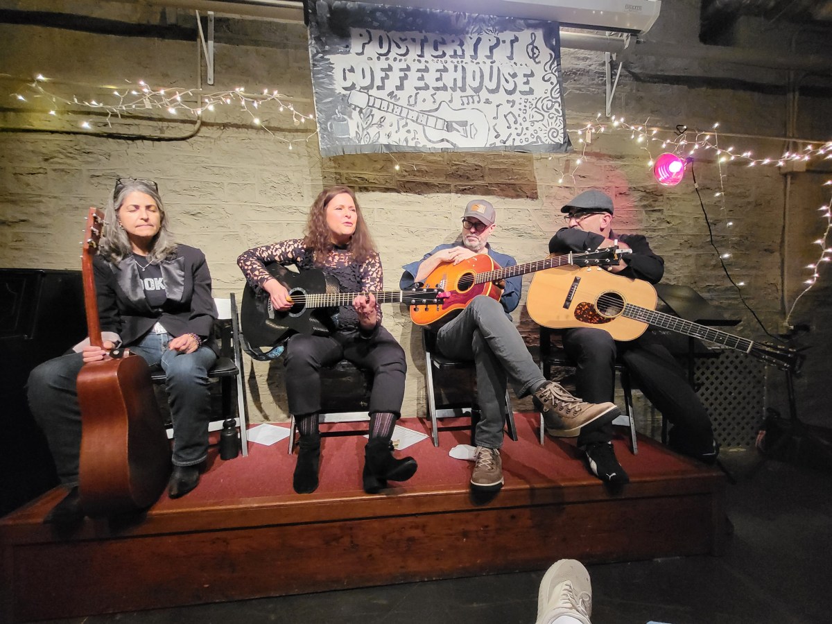 We all got nostalgic when we went down into the postcrypt. They’ve played it before. Looking at the pictures behind the refreshment counter is taking a trip back in time. I think they all date back further than the first time I went something like 25 years ago. My favorite is Pete Kennedy and Maura Boudreau, it’s from before they got married. Tina spotted her magnet on the refrigerator from when she played there around when her first album came out. We all noticed Ina May Wool’s picture. Ina May came to the show and sat right by her picture. Rich, Carolann’s bandmate from CC Railroad sat with us. Rich, Mark, Carolann, and Tina all met at the late lamented Sun Music on the Upper East Side. I went there too but I remember it being on the upper west side. I trust the memory of all of them, and Cheryl who was also in CC Railroad more than mine alone. Again, that is not a dig at myself. It’s important to be aware of the plasticity of our memories.