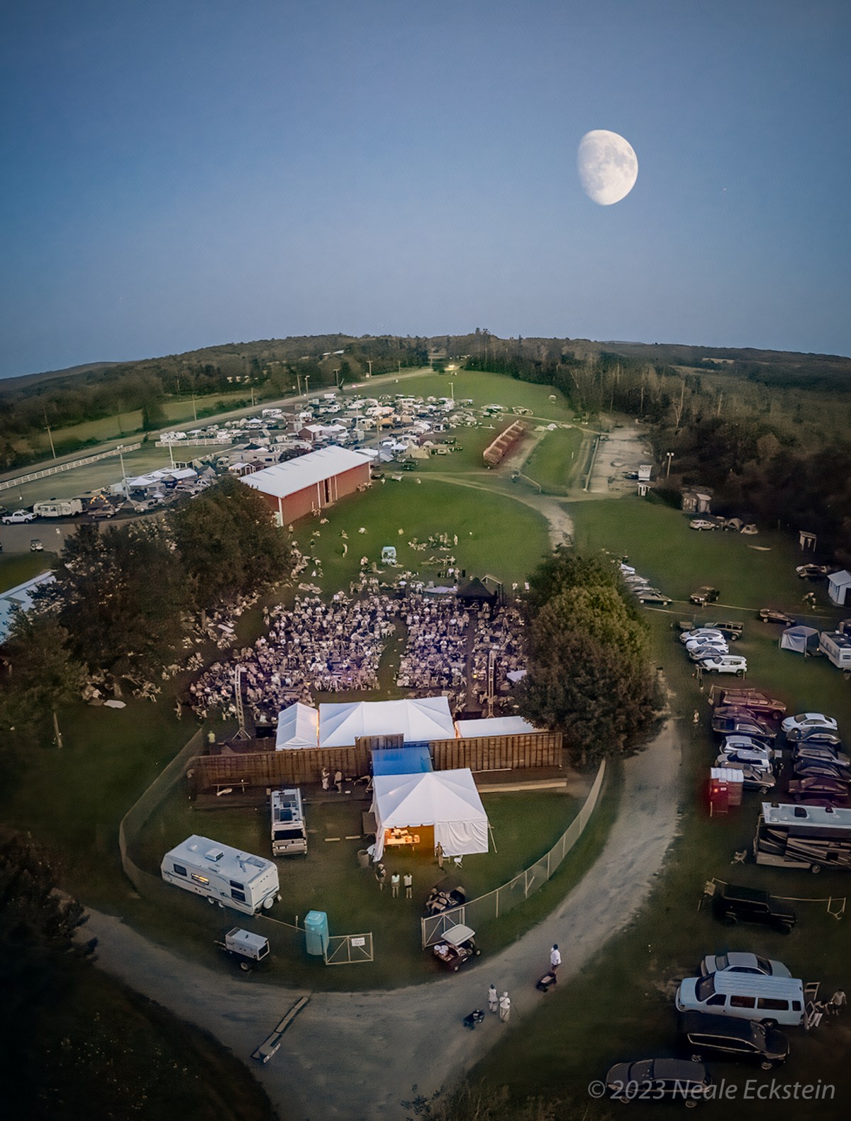 For the first time since 2019 I had my normal Falcon Ridge transportation, Fred drove me. The experience starts with his arrival. We went up as is our want a day early, Wednesday. For the first time we were the first of our camping community to arrive and we had to stake out the land for our group. This was Fred’s first time at the new site in Goshen, so I chose the spot. I don’t know how I did; the ground was not quite flat, but it was close to where we camped last year, and I thought that would make it easy for people to find us. Paul did and we set up our tents. The Joe’s party, Joe, Andrea, Cate, Lynx, and Genevieve came with their RV. Once we were safely found Fred, Paul, and I went to eat. Mel was there before all of us but camped with the volunteers. She is part of the family so hung out with us.